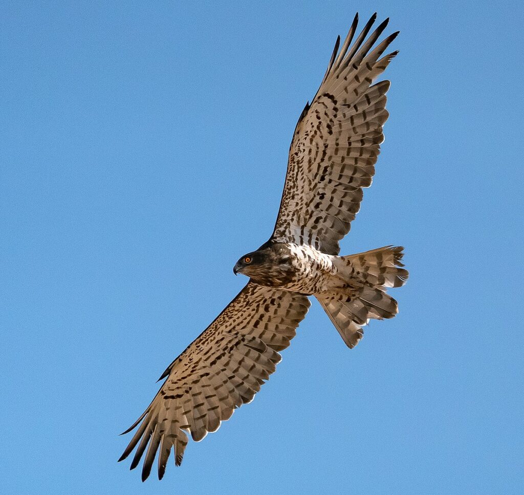 Il biancone è un grande rapace facilmente riconoscibile per il suo piumaggio chiaro e il volo maestoso. I suoi occhi gialli e penetranti sono un tratto distintivo, tipico di un predatore visivo altamente specializzato. Durante il volo, il biancone adotta una posizione planante caratteristica, con le ali lunghe e larghe leggermente sollevate. Le ali presentano bordi scuri, mentre la parte inferiore è chiara e uniforme, contrastando con la testa e il petto chiari, arricchiti da leggere striature marroni.